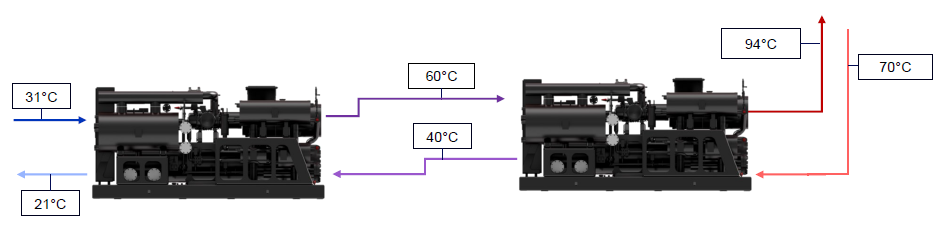 Example: simultaneous production of glycolated water at -4/ -8°C and hot water at 45/ 65°C.