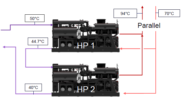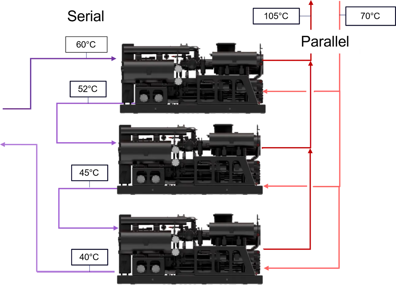 - Low or high temperature difference for the source and/or the rejection: we take advantage of the temperature profiles to offer several machines in parallel or in series on the secondary loops in order to optimise energy performance while ensuring stable operation.