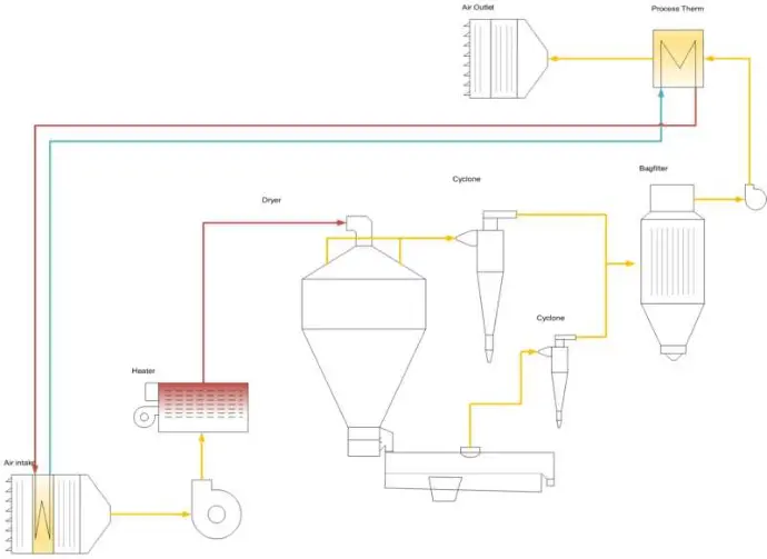 Process Therm capte la chaleur de l'air chargé de poussière et d'humidité. Il s'installe facilement dans de nouvelles usines ou en rétrofit. La chaleur récupérée sert principalement à réchauffer l'air entrant, mais peut aussi alimenter d'autres applications comme le chauffage de process ou un réseau de chauffage urbain.