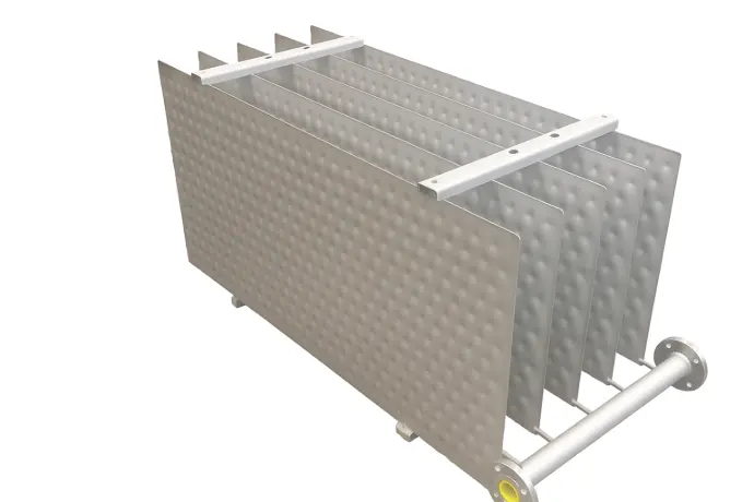 Cet échangeur de chaleur se compose d'un certain nombre de Pillow Plates verticales et d'un système de distribution d'eau.